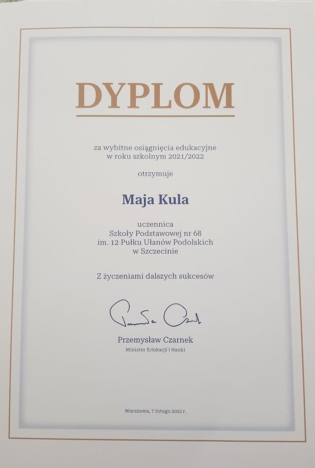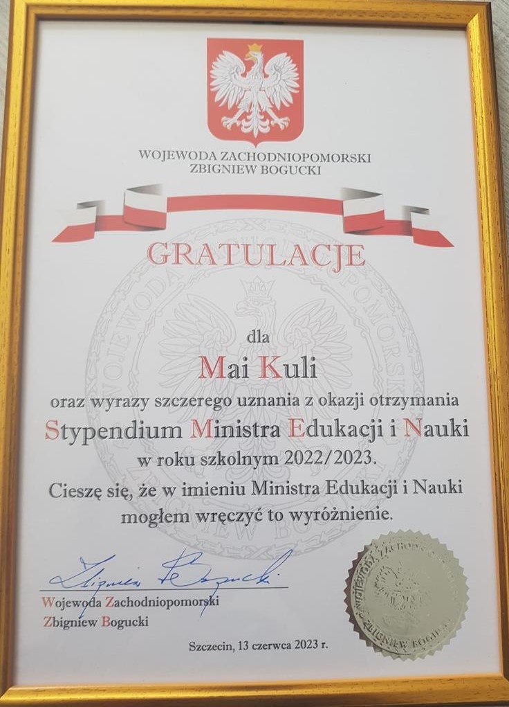 Te szczególne wyróżnienia uczennice otrzymały z rąk Pani Kurator Oświaty – Katarzyny Koszewskiej oraz Pana Zbigniewa Boguckiego – Wojewody Zachodniopomorskiego na uroczystej gali, która odbyła się we wtorek, 15 czerwca w SP 35 w Szczecinie. Liczne osiągnięcia sportowe Mai oraz sukcesy muzyczne Oli zarówno na szczeblu ogólnopolskim jak i międzynarodowym zyskały uznanie i zostały wyjątkowo nagrodzone.