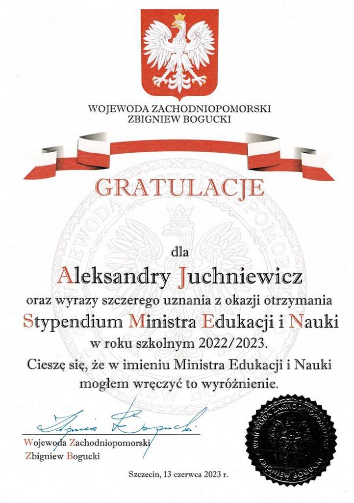 Z dumą zawiadamiamy, że ubiegłoroczne absolwentki naszej szkoły : Maja Kula oraz Aleksandra Juchniewicz otrzymały stypendia Ministra Edukacji i Nauki za wybitne osiągnięcia w roku szkolnym 2021/2022.