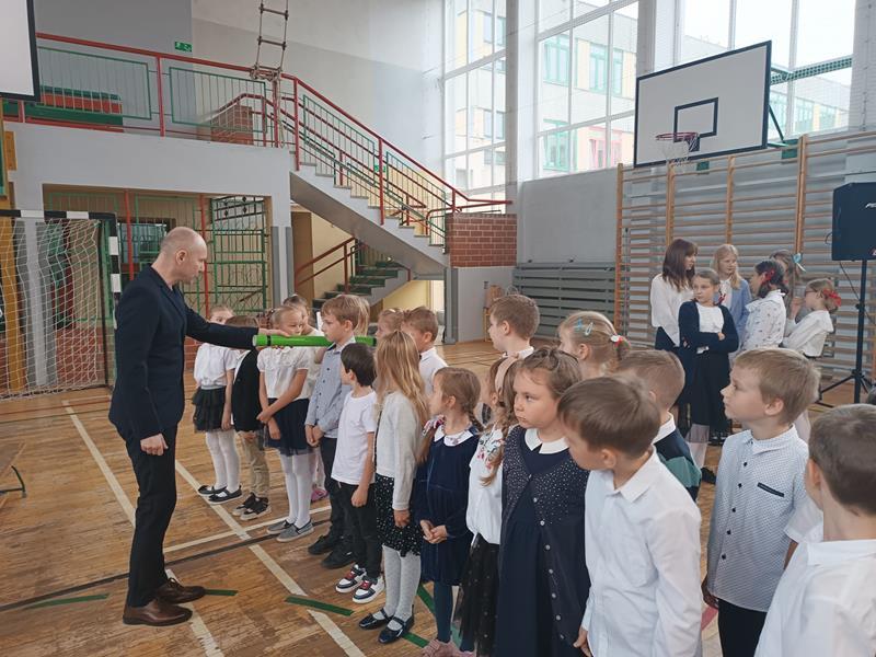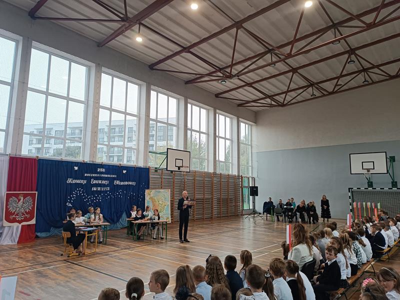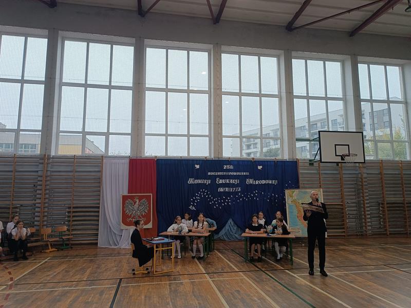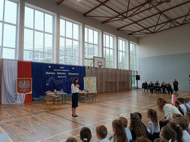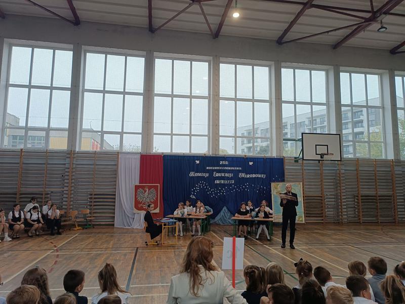 W piątek 13.10.2023r. na niezwykłą lekcję kaligrafii zaprosili nas uczniowie ze Szkolnego Koła Teatralnego wraz z opiekunką panią Anną Tomczyk. Lekcja ta odbyła się dla wszystkich uczniów naszej szkoły w czasie uroczystego apelu poświęconego obchodom 250. rocznicy powołania Komisji Edukacji Narodowej. W czasie uroczystości poznaliśmy krótką historię związaną z okolicznościami powstania w Polsce w roku 1773 pierwszego w kraju i Europie systemu edukacyjnego przedstawioną przez uczennice z klasy 7a.