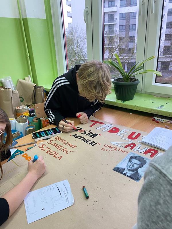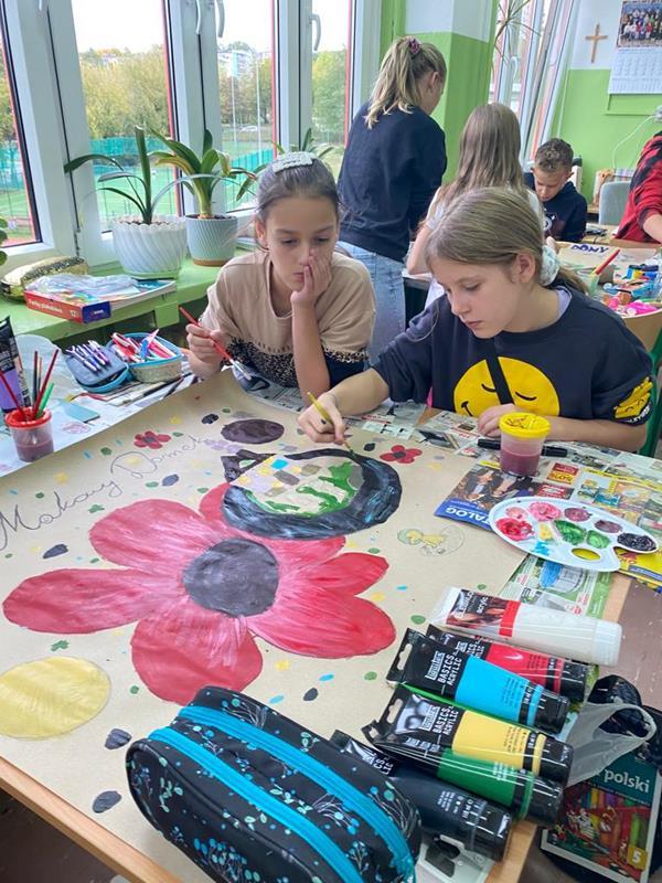 - Lekcja w klasie 5d – Praca plastyczna w grupach „Poetyckie wyobrażenia o wszechświecie w wierszu Czesława Miłosza „Przypowieść o maku”.