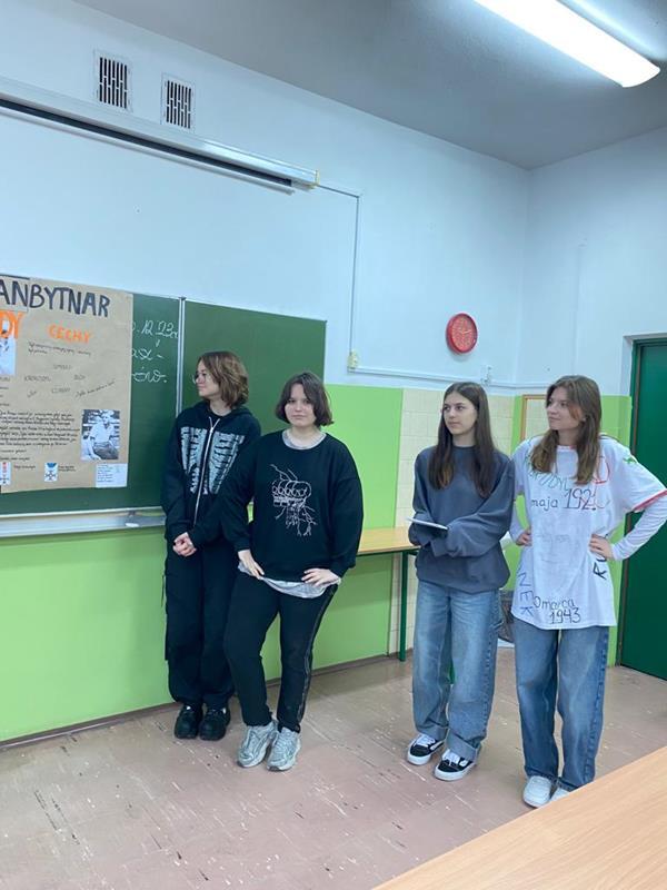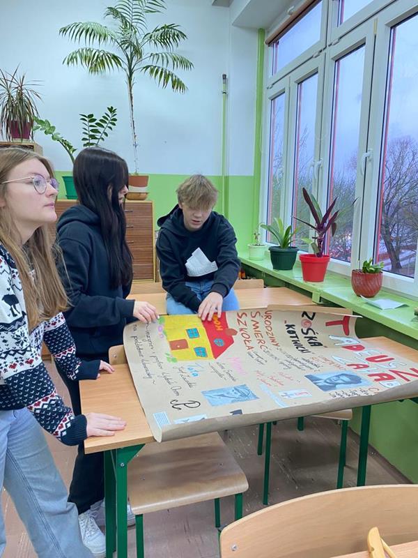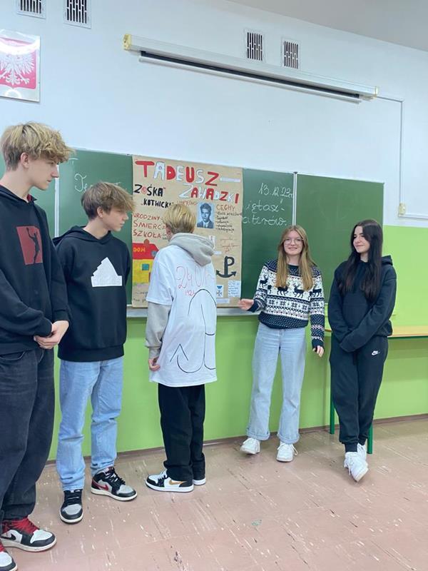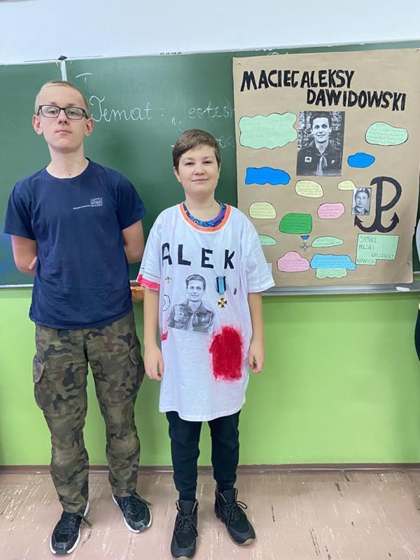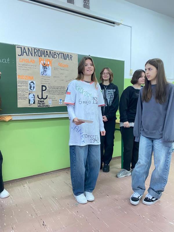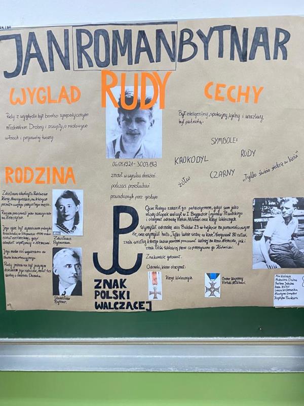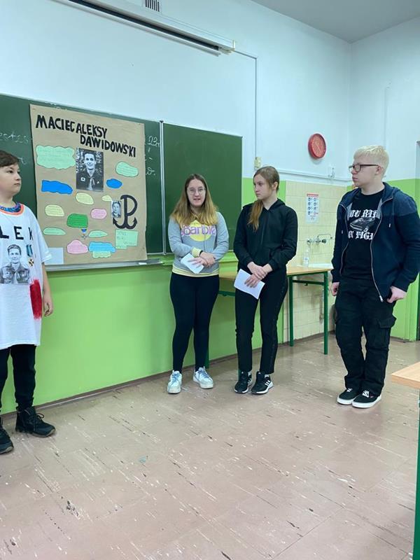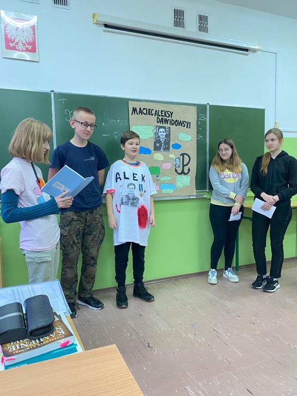 Cykl lekcji był poświęcony pracy z lekturą Aleksandra Kamińskiego „Kamienie na szaniec”. Uczniowie klasy 8c, pracując w grupach, przygotowali w atrakcyjny sposób prezentację głównych bohaterów powieści – dokumentu z czasów II wojny światowej: Rudego, Alka i Zośki.