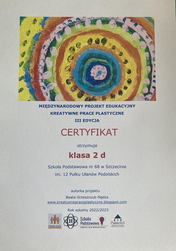 Uczniowie klasy II d w roku szkolnym 2022/2023 realizowali Międzynarodowy Projekt Edukacyjny „Kreatywne Prace Plastyczne” III edycja. Warunkiem ukończenia projektu było zaliczenie 9 zadań, polegających na wykonaniu prac plastycznych w różnych technikach malarskich, rysunkowych i mieszanych. Celem projektu było zaspakajanie naturalnej potrzeby tworzenia sztuki, wyzwalanie ekspresji twórczej i wspieranie harmonijnego rozwoju oraz kreatywności uczniów poprzez działania plastyczne. Przez cały rok uczniowie uczyli się pracować różnymi technikami plastycznymi, używać różnych, czasem niestandardowych narzędzi, rozróżniać barwy, tekstury, nazywać i rozróżniać materiały, z których wykonane były ich prace. Proces planowania, tworzenia i ekspresji własnej dostarczył młodym twórcom wielu wrażeń, radości i satysfakcji.