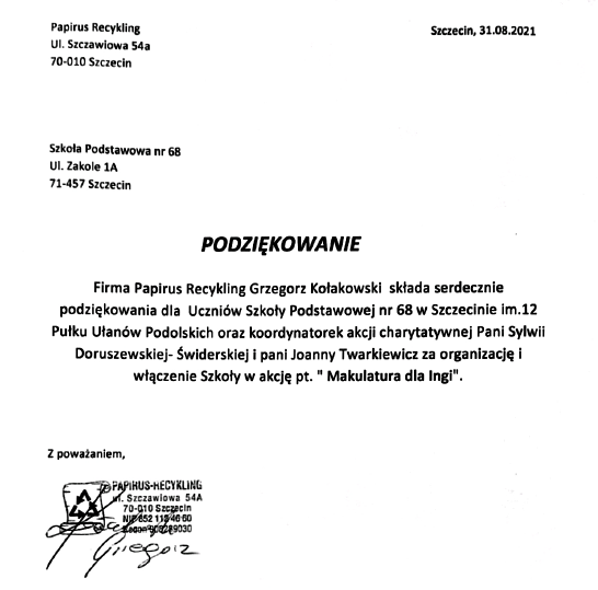 Przed końcem roku szkolnego 2020/2021r. za pozwoleniem Dyrekcji naszej szkoły włączyliśmy się do akcji pt. „Makulatura dla Ingi”. Nasza akcja na terenie szkoły cieszyła się ogromnym zainteresowaniem wśród uczniów ich rodziców oraz nauczycieli, a także pracowników obsługi. Uczniowie chętnie zostawiali swoje ćwiczenia, niepotrzebne książki i zeszyty itp. Dzięki życzliwości pani kierownik Ekoportu podstawiono pod naszą szkołę 8 kontenerów, ponieważ zabrakło ich kiedy przez dwa dni na „własną rękę” zawoziliśmy tam makulaturę. Za pomoc Wszystkim, którzy wspólnie z nami pomagali małej Indze z Przęsocina w akcji pt. „Makulatura dla Ingi” dziękujemy.