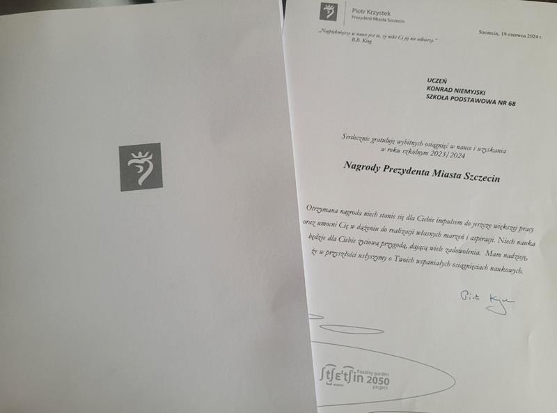 W dniu 19 czerwca 2024 roku w Liceum Ogólnokształcącym nr 1 odbyła się uroczystość wręczenia Nagród Prezydenta Miasta Szczecin za wybitne osiągnięcia szkolne. Na tak wysokie wyróżnienie zasłużył Konrad Niemyjski z klasy 8a. Jest on finalistą konkursów organizowanych przez Zachodniopomorskiego Kuratora Oświaty z języka angielskiego oraz historii.