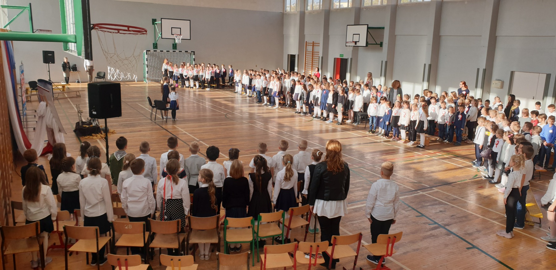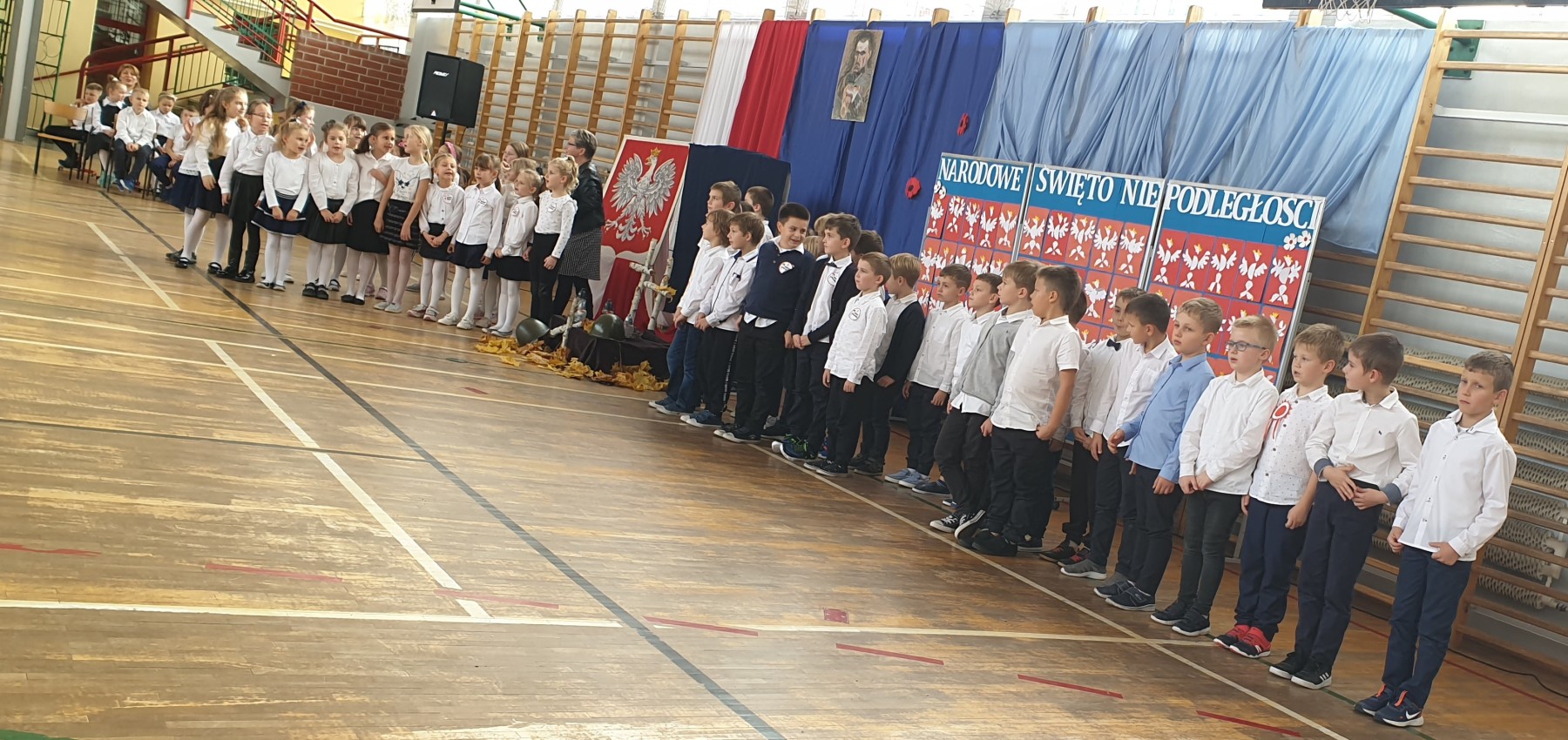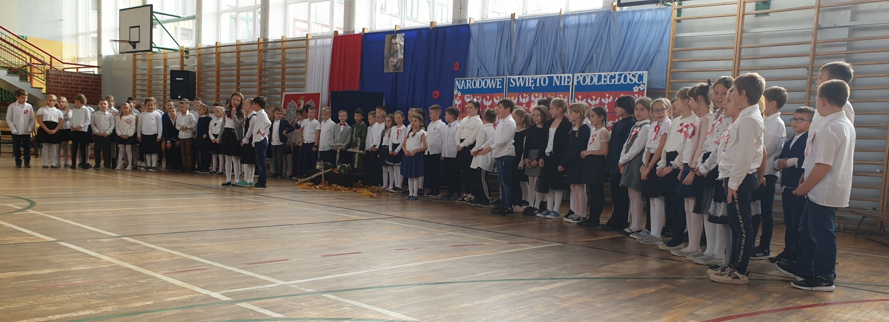 W czwartkowe przedpołudnie (10 listopada) w sali gimnastycznej uczennice i uczniowie klas I-III wzięli udział w uroczystym apelu z okazji Dnia Niepodległości. W czasie akademii przypomniano historię czasów zaborów oraz odzyskania niepodległości w 1918 roku. Zrobili to między innymi przy pomocy pieśni patriotycznych.