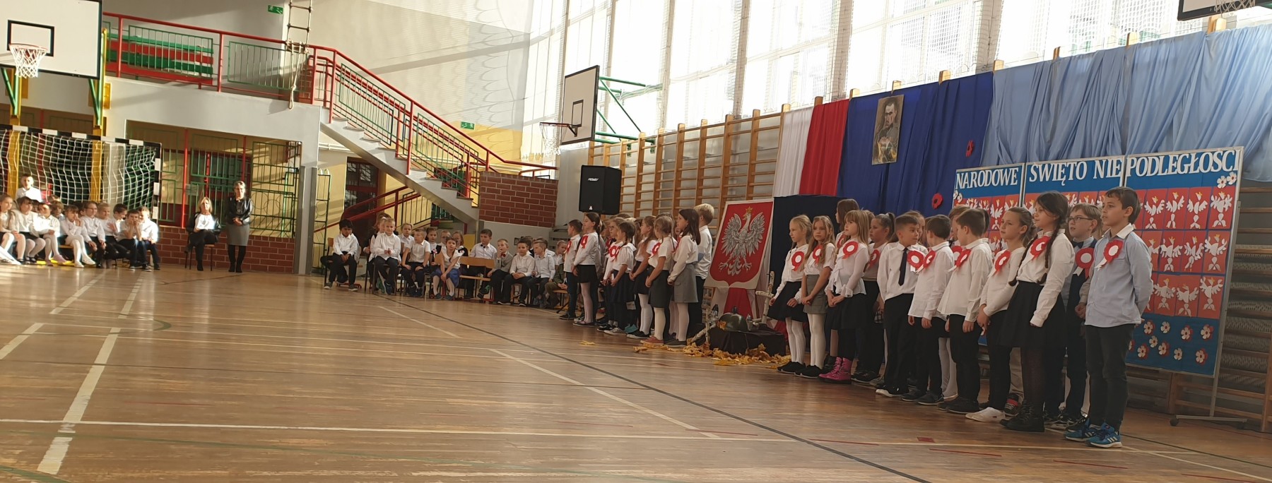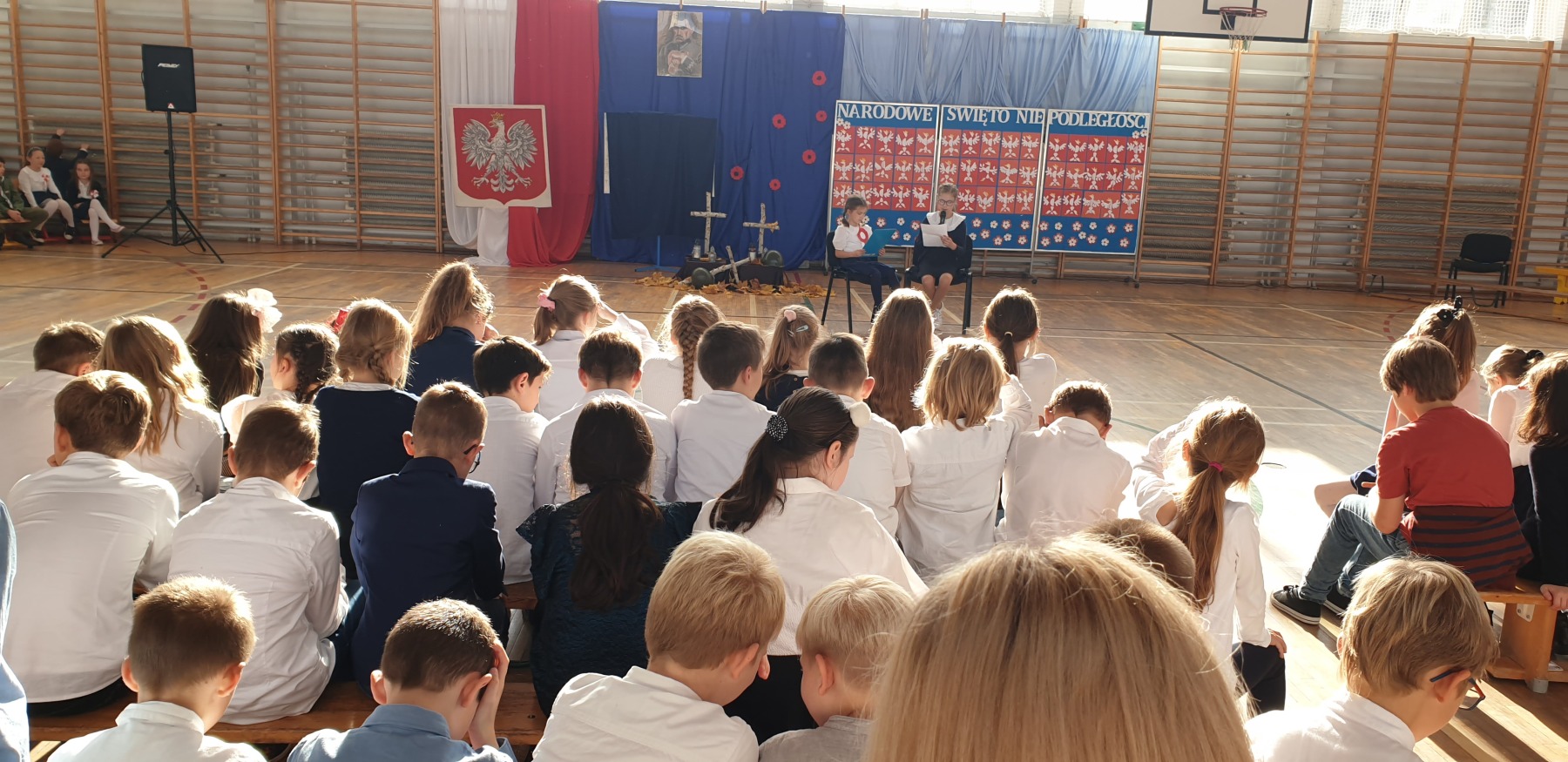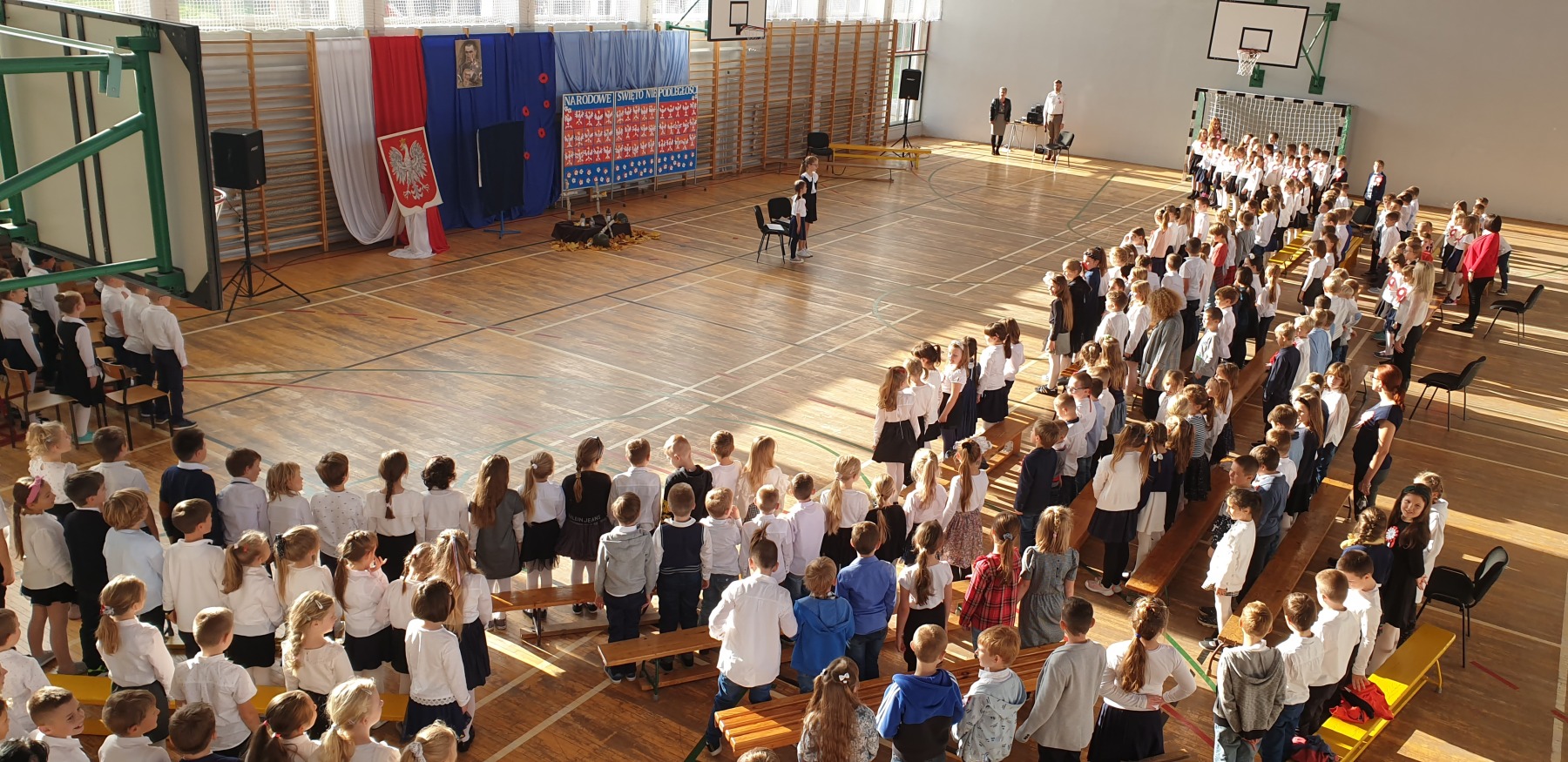 W czwartkowe przedpołudnie (10 listopada) w sali gimnastycznej uczennice i uczniowie klas I-III wzięli udział w uroczystym apelu z okazji Dnia Niepodległości. W czasie akademii przypomniano historię czasów zaborów oraz odzyskania niepodległości w 1918 roku. Zrobili to między innymi przy pomocy pieśni patriotycznych.
