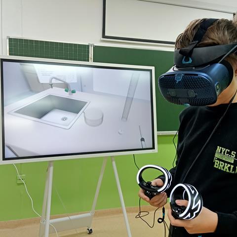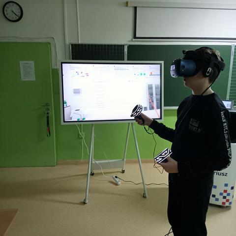 Uczniowie chętnie używają nowych technologii, dlatego z dużą radością i zaangażowaniem przeprowadzają wirtualne doświadczenia chemiczne używając gogli oraz kontrolerów.