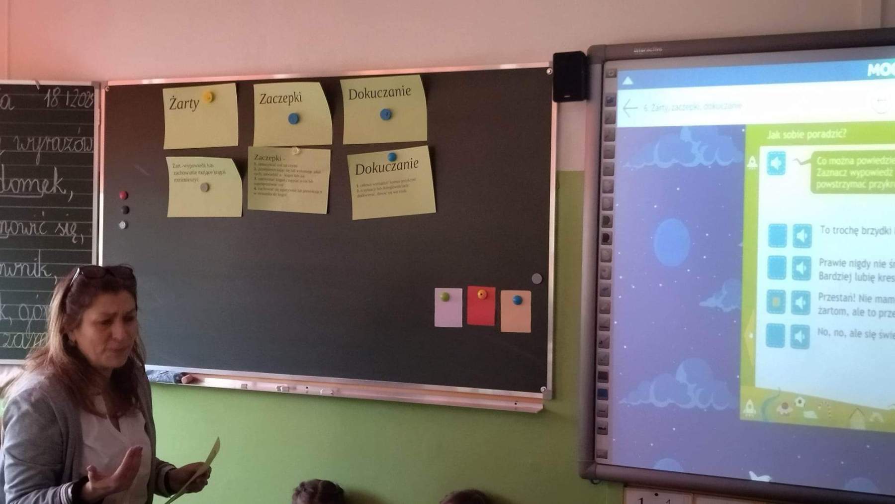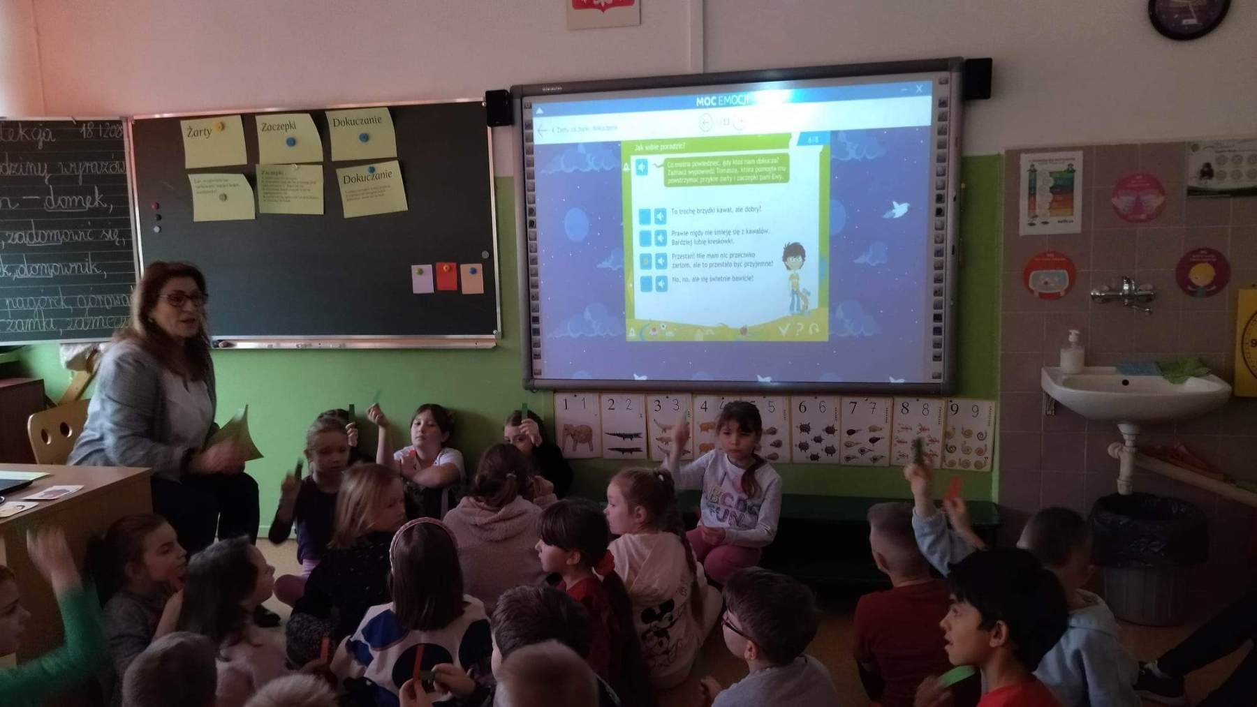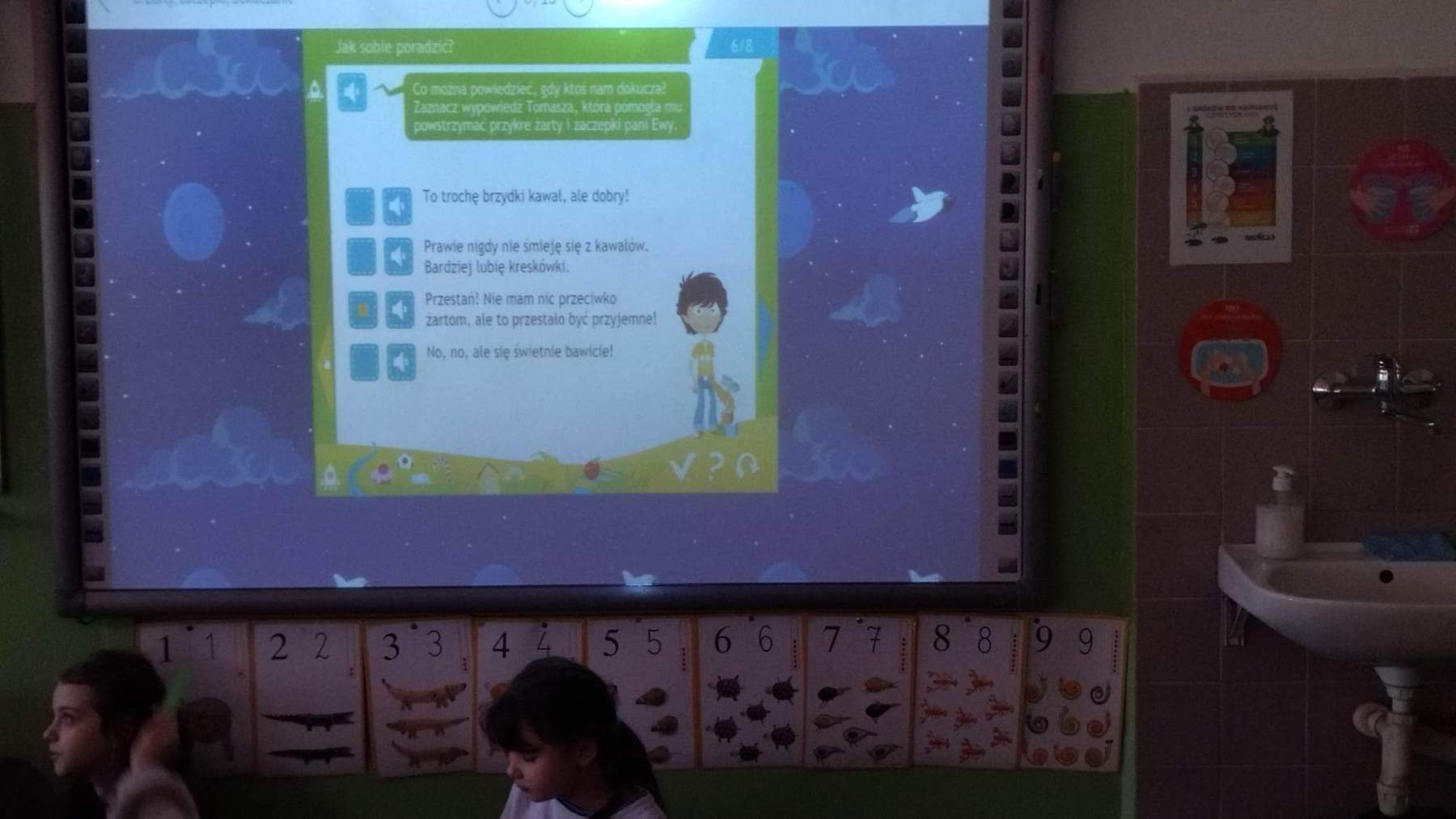 Dnia 18 stycznia w sali 22 w klasie 2b odbyły się zajęcia otwarte z treningu umiejętności społecznych. Tematem przewodnim lekcji były „Żarty, zaczepki, dokuczanie”. Uczniowie mogli obejrzeć film animacyjny, wziąć udział w dyskusji, dokonać oceny zachowania bohaterów kreskówki oraz rozpoznawać i nazwać emocje towarzyszące . Podczas lekcji wykorzystano sprzęt multimedialny i program edukacyjny przekazany naszej szkole przez Urząd Miasta Szczecin w ramach projektu pomocy pedagogiczno – psychologicznej .